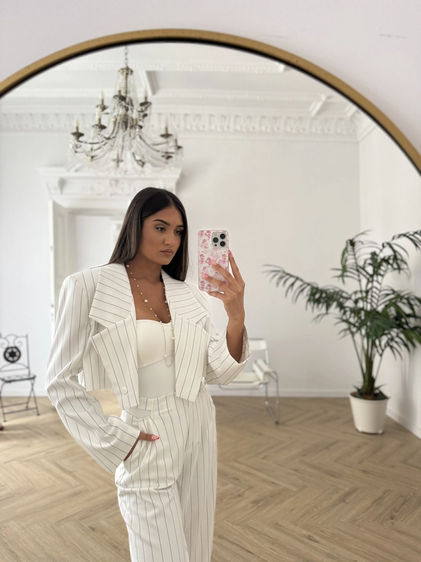 Elegant suit in a timeless striped pattern. A short button-down jacket and high-waisted pants create a cohesive, stylish ensemble. The perfect choice for the office, business meetings and special occasions.