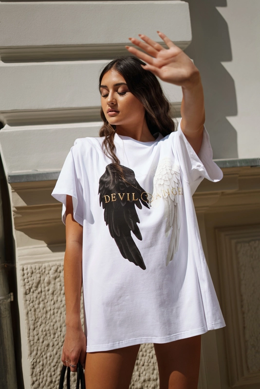 Oversize'owy t-shirt z oryginalnym nadrukiem, który doda charakteru każdej stylizacji. Idealny na luzie- do szortów lub legginsów.